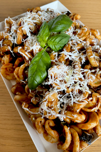 Elegante vassoio pasta di Gragnano, mozzarella, pomodorini, basilico, olio evo, sale disponibile nella versione da 8-10 porzioni (1500 gr circa) o da 4- 5 porzioni (750 gr circa)