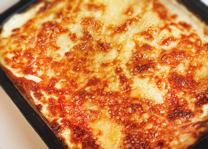 Elegante vassoio da forno con porzioni di Lasagnetta zucchine e mozzarella di bufala