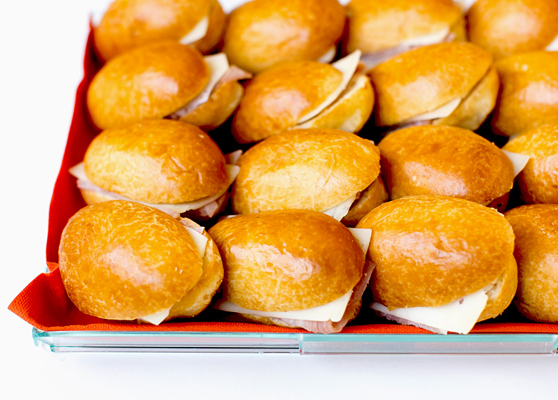 Elegante vassoio di piccoli paninetti al latte con prosciutto cotto e fontina.
